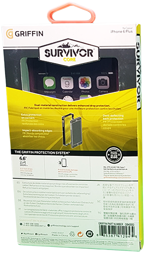 Forro Griffin Survivor Core iPhone 6 Plus, protege contra 18 horas de vibración de agitación ósea, de 20 a 2000 ciclos por segundo.